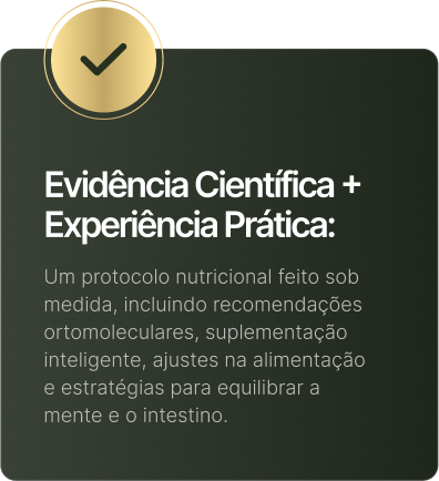 Um protocolo nutricional feito sob medida, incluindo recomendações ortomoleculares, suplementação inteligente, ajustes na alimentação e estratégias para equilibrar a mente e o intestino.